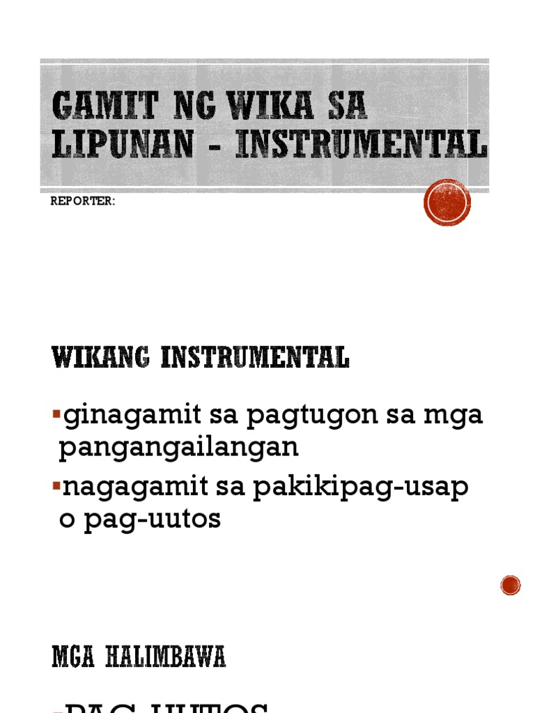 Ang isa pang gamit ng wika sa lipunan ay ang pagiginig instrumental nito. Gamit o Tungkulin ng Wika ayon kay MAK Halliday Isa sa nagbigay ng kategorya nito ay si MAK Halliday na naglahad sa pitong tungkulin ng wika na. Ayon kay Josefina Mangahis et al 2008 mahalagang instrumento sa pakikipagkomunikasyon ang wika.